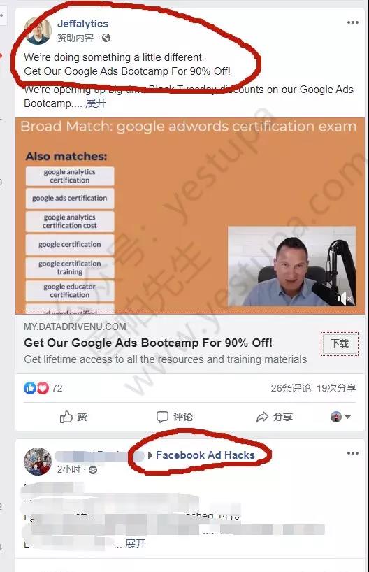 拿我自己做例子,我的Facebook小号加了好多关于脸书广告投放的群组,如图中下框的Facebook Ad Hacks这个群,所以Facebook就知道我是一个很喜欢Facebook广告的人,甚至是从业者(我在个人介绍也有填写)。