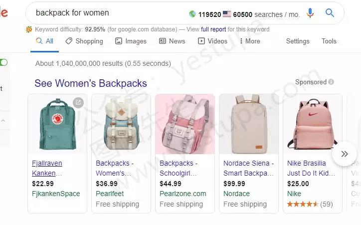 我搜女性包包,可能我是一个对服饰感兴趣的人,但谷歌不会展示女性衣服或裤子的广告给我——因为我没有进行相关搜索!