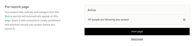一旦你的项目被批准,你就可以激活一个预启动页面,此页面与你的项目具有相同的网址,其中,预启动页面里一般会包括项目标题副标题、图片、动图不等,一般来说素材越充足越好,最重要的是这个页面里面会有一个按钮,可以让感兴趣的潜在backer在项目上线时要求得到通知。因此您可以在启动之前开始传播此消息。