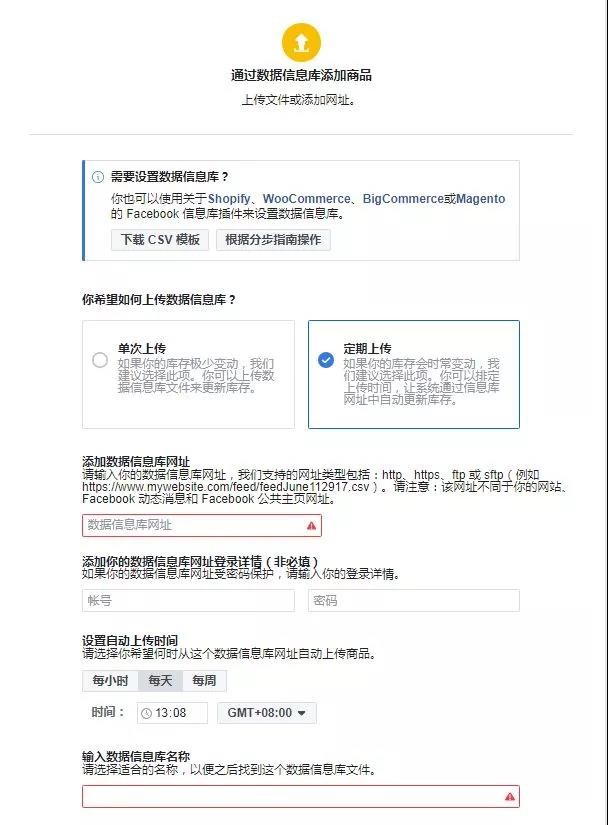 (六)添加商品(有三种添加方式,一般使用第二种上传方式居多,建议您使用定期上传,这样您的数据库会定时自动上传更新,省去您的很多麻烦。在页面添加数据信息库网址和数据信息库名称,这样你的商品就添加到数据库中了)