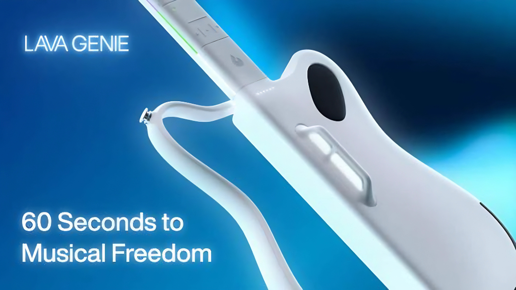 LAVA GENIE 是一款无弦吉他,配备触摸指板和切割式琴身设计,用户可以直接在内置样本上敲击演奏。设备内置500+乐器预设和10,000+曲目,支持多种采样风格和节奏调整,可通过拿火+ App 导入音视频。