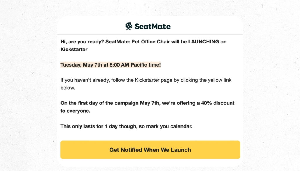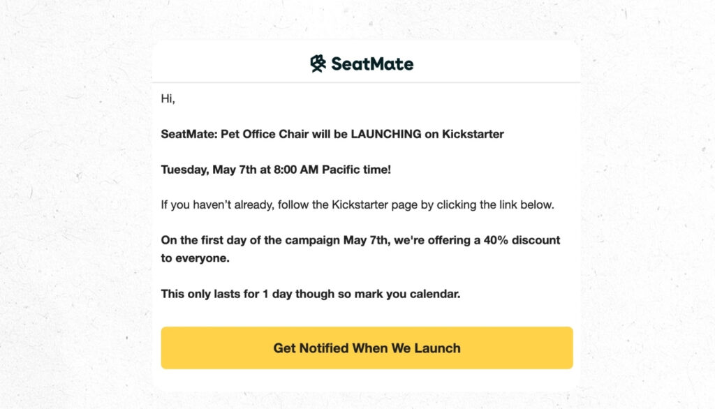 SeatMate宠物家具项目是邮件营销的成功案例。它们不是频繁发送产品开发更新,而是集中精力制作少量引人入胜的邮件,促使用户采取行动。