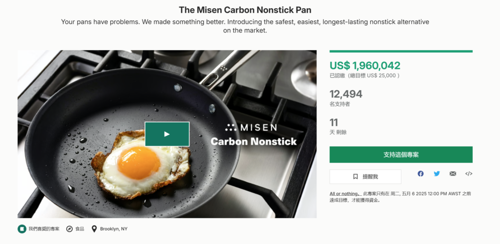 Misen Carbon 无涂层不粘锅在 Kickstarter 创下众筹佳绩:30 天内吸引 12,492 名支持者,截止目前筹得约 196 万美元(约合人民币 1420 万元),超目标金额 78 倍,成为 2025 年厨房用品领域的爆款项目。