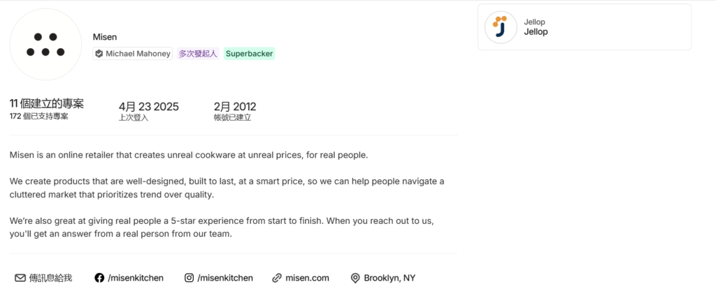 品牌众筹历史:强调 Misen 在 Kickstarter 的 10 年经验(首个项目 2015 年众筹超 $100 万,累计 11 个项目,13.2 万支持者),展示成熟的供应链和用户基础。