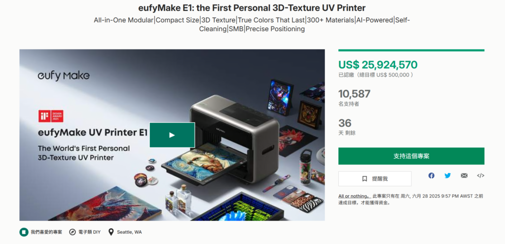 2025 年 4 月 29 日,Anker 子品牌 eufyMake 旗下桌面级 3D 纹理 UV 打印机 E1 登陆 Kickstarter,创下 12 小时破千万美元、3 周筹款超 2500 万美元的行业纪录,支持者突破 1.2 万人。
