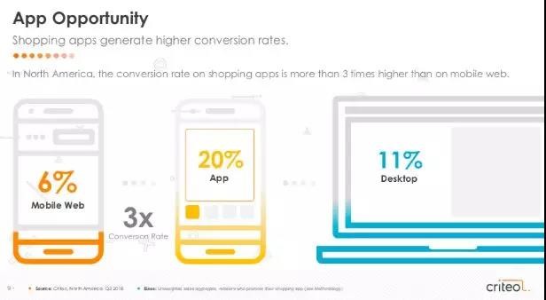 根据Criteo的报告,在北美,购物App的转化率达到了20%,是移动网页(6%)的3倍以上,PC端的转化率也仅达到了11%(如上图)。对于志在开发移动端用户的零售商,开发自己购物App作为自己的主要产品展示渠道是非常有必要的。