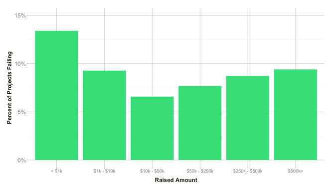 从项目的众筹金额看,沃顿商学院分析发现,小项目的失败率最高。如下图所示: