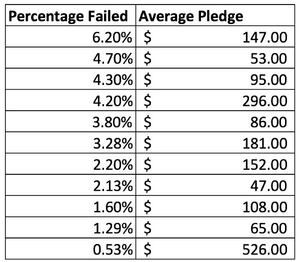 从这些众筹项目可以看出,信用卡扣费失败的平均百分比约为3%。因此,我建议以后在估算扣费失败可能性时用这个数字。