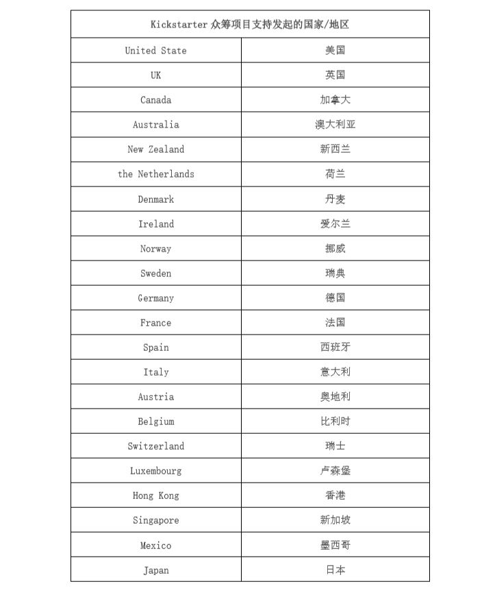 Kickstarter平台针对众筹项目支持发起的国家/地区,是一个不断更新的国家/地区列表,因此,在启动项目之前最好去平台的支持中心查看最新列表。Kickstarter平台目前支持发起的国家/地区: