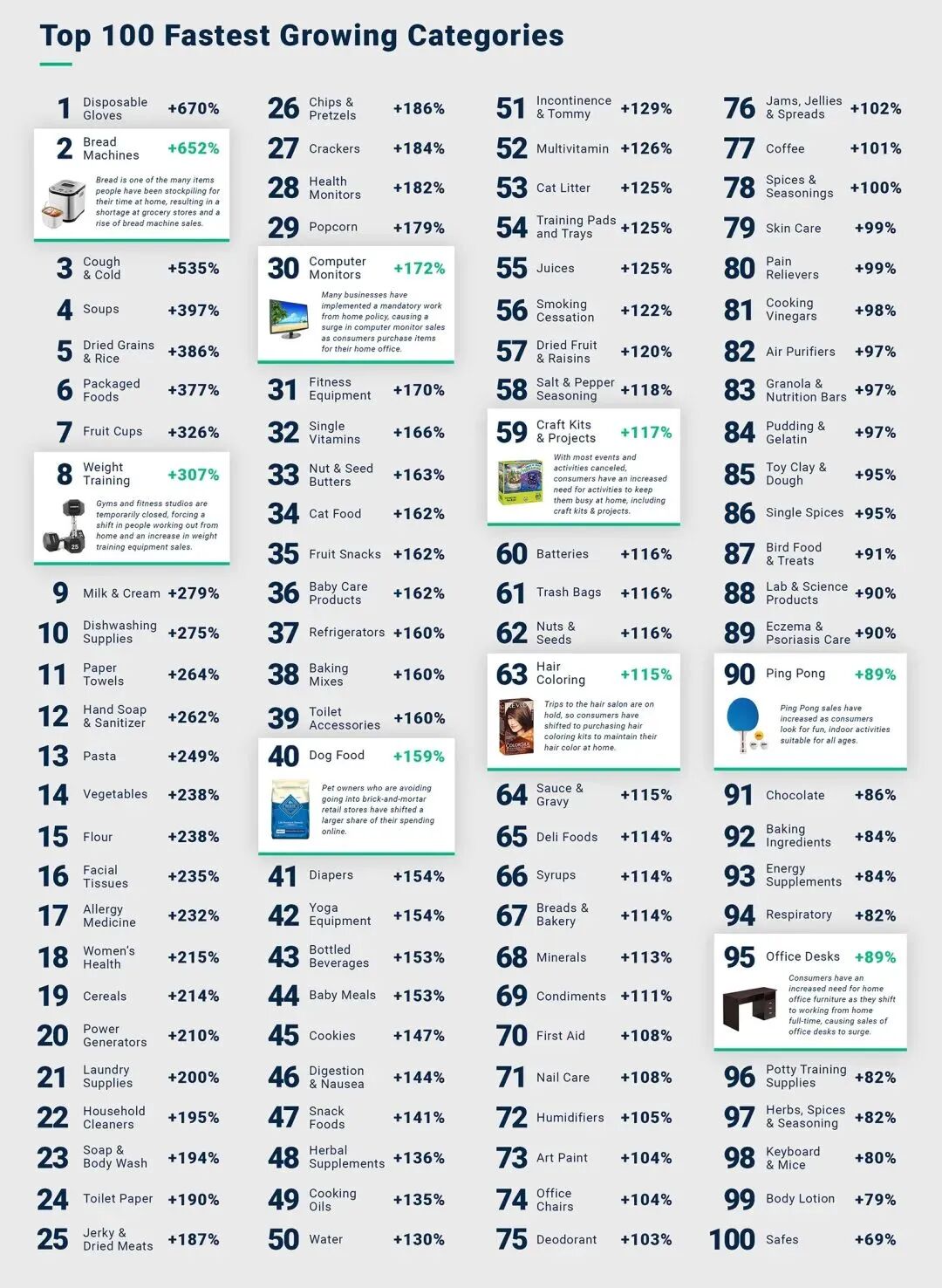 知名调研机构Stackline发布了一份关于调查报告,美国同比去年线上交易中,在增长最快以及下降最大的100种类目。