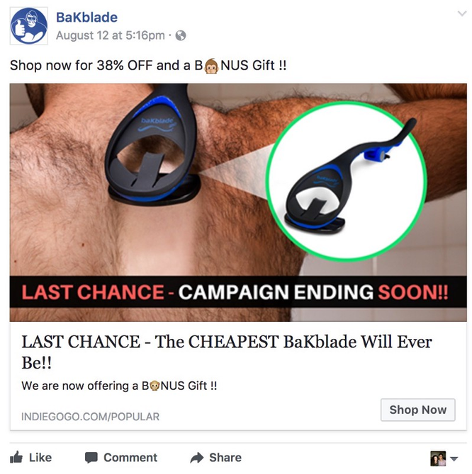 简单来说,再营销就是向已经以某种方式与你的品牌互动过的用户做广告。在这一策略中,我们将特别关注那些已经访问过Indiegogo活动页面但还没有购买的用户。以BaKblade 2.0为例,我们决定以低于零售价38%的价格向那些还没支持我们活动的用户提供秘密优惠。