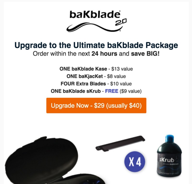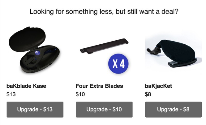许多项目页面上列出了附加的公共福利,我们要尽量远离这个策略,因为它会增加你提供额外服务的复杂性,使得主要产品不那么显眼。优惠是按价格高低(从最低到最高)排列的,而附加品通常比主要产品更便宜,所以附加品往往会出现在优惠列表的顶部。尽可能多地使用秘密优惠,并在人们已经支持这项活动后,策略性地向他们推销这些额外优惠。例如,在BaKblade 2.0的Indiegogo Indemand活动中,我们使用Mailchimp自动向支持者发送促销报价电子邮件。具体如下: