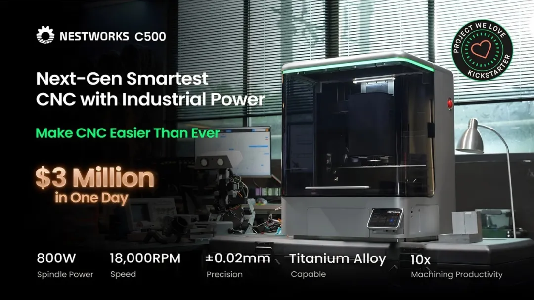 又一款上线即爆的桌面智能 CNC,这款 CNC 来自深圳品牌 Elephant Robotics ,上线首日募集金额即破三百万美元。C500 加工面积可达 280×235×150mm,搭载 800 W 主轴,最高转速 18,000 RPM,重复定位精度 ±0.02 mm。