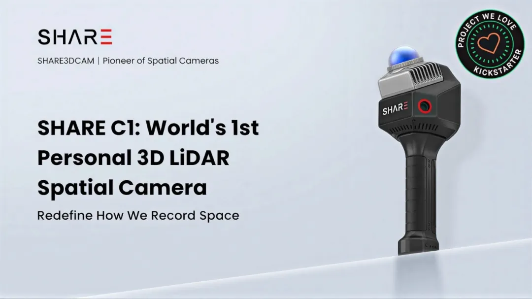 SHARE C1 是一款个人 3D LiDAR 空间相机,集成 360° LiDAR 扫描与双广角彩色摄像头,提供亚厘米级 (<1 cm) 精度,扫描范围可达 70 米。