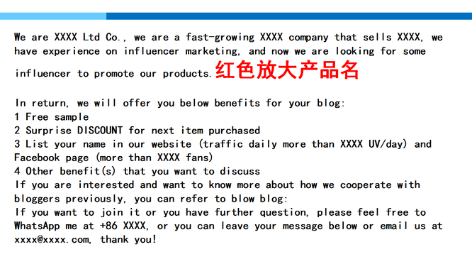 上图就是一封给红人发送的邮件,我在上面标注了红色放大产品名,这样红人可以一眼看到产品是什么,尽快决定是否合作,内容上第一个就是自我介绍,写得比较官方,可供参考。下面介绍了合作后红人可以得到的好处,比如是否向他支付佣金,这一点来说国外的红人被惯坏了,中国人都在给他们送钱,不给钱的合作比较难。免费的样品是一定的,还有discount给粉丝的福利,如果你自己也有网站的话可以跟他一起进行推广等。大家可以参考这个模式去跟红人谈。另一种就是直接发给红人“我提供给你XX钱,你跟我合作,我的产品是XX”。非常直截了当,但这种方式有一个缺点是回复你的红人就只看钱,可能做的视频的质量非常低,大家要根据自己的情况进行规划,是要短时间内做个视频,还是说要发展一个稳定的红人跟他长期合作。