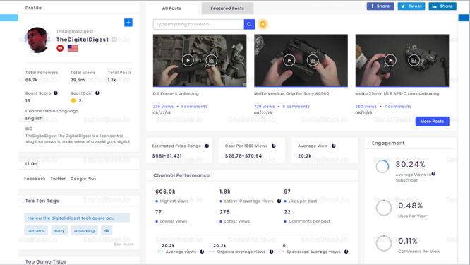 这一点也有许多要注意的问题,比如有的人粉丝数量看着多,却是死粉(曾经这个人发过了很多有趣的视频前期得到了粉丝关注,后期的都很无趣,粉丝对他不再关心,再发的内容粉丝不会再去看甚至取关)。也有些人的粉丝数量不大,但浏览量非常高,有两方面原因,一是他自己做推广能力非常强,因为YouTube有自己的推广(广告、关键词、站外等推广方式),二是粉丝活跃度高,对红人非常信赖,他每次发的内容粉丝都迫不及待要关注。